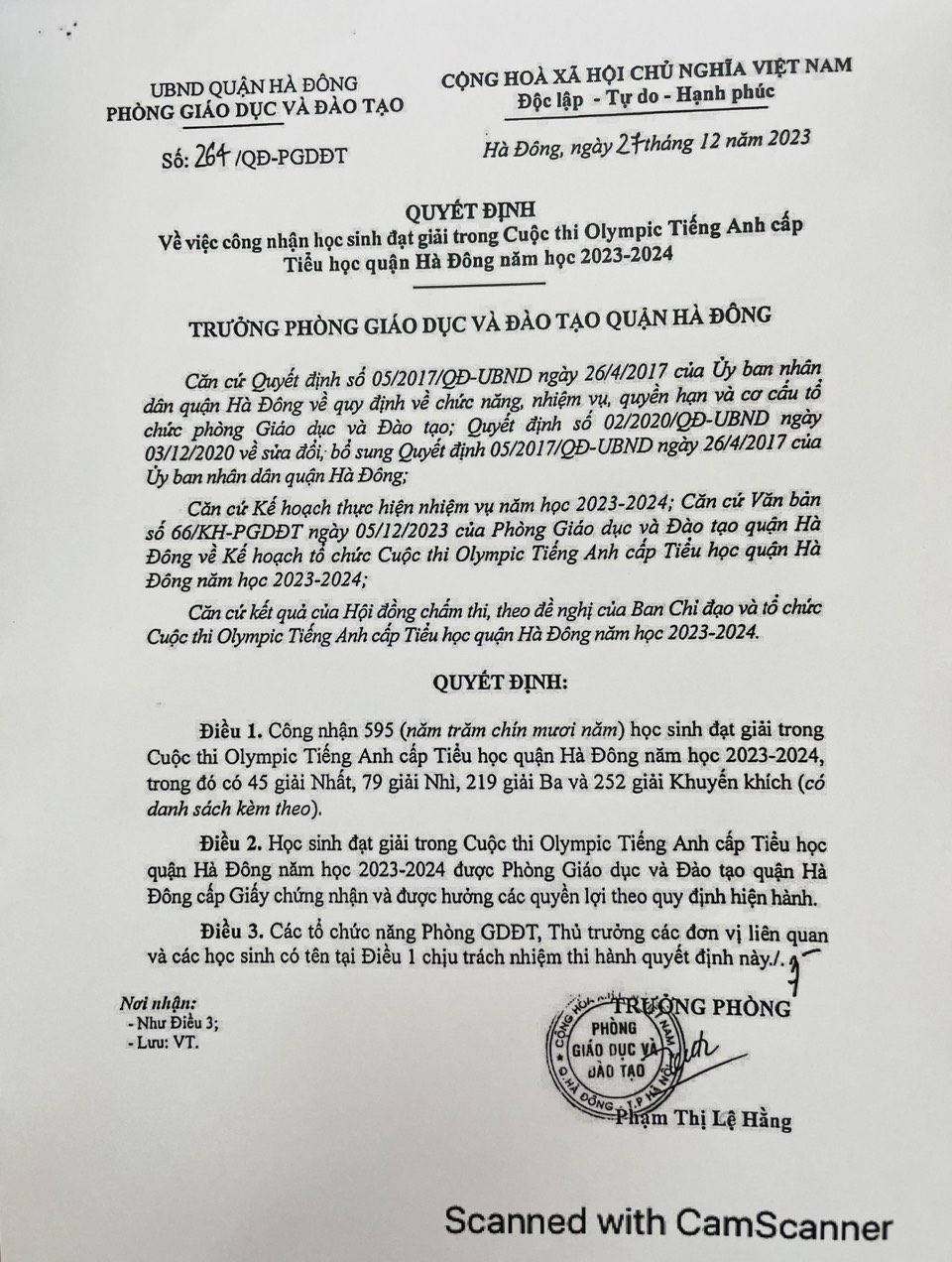 33 Học sinh xuất sắc đạt giải tại cuộc thi Olympic TA cấp Quận