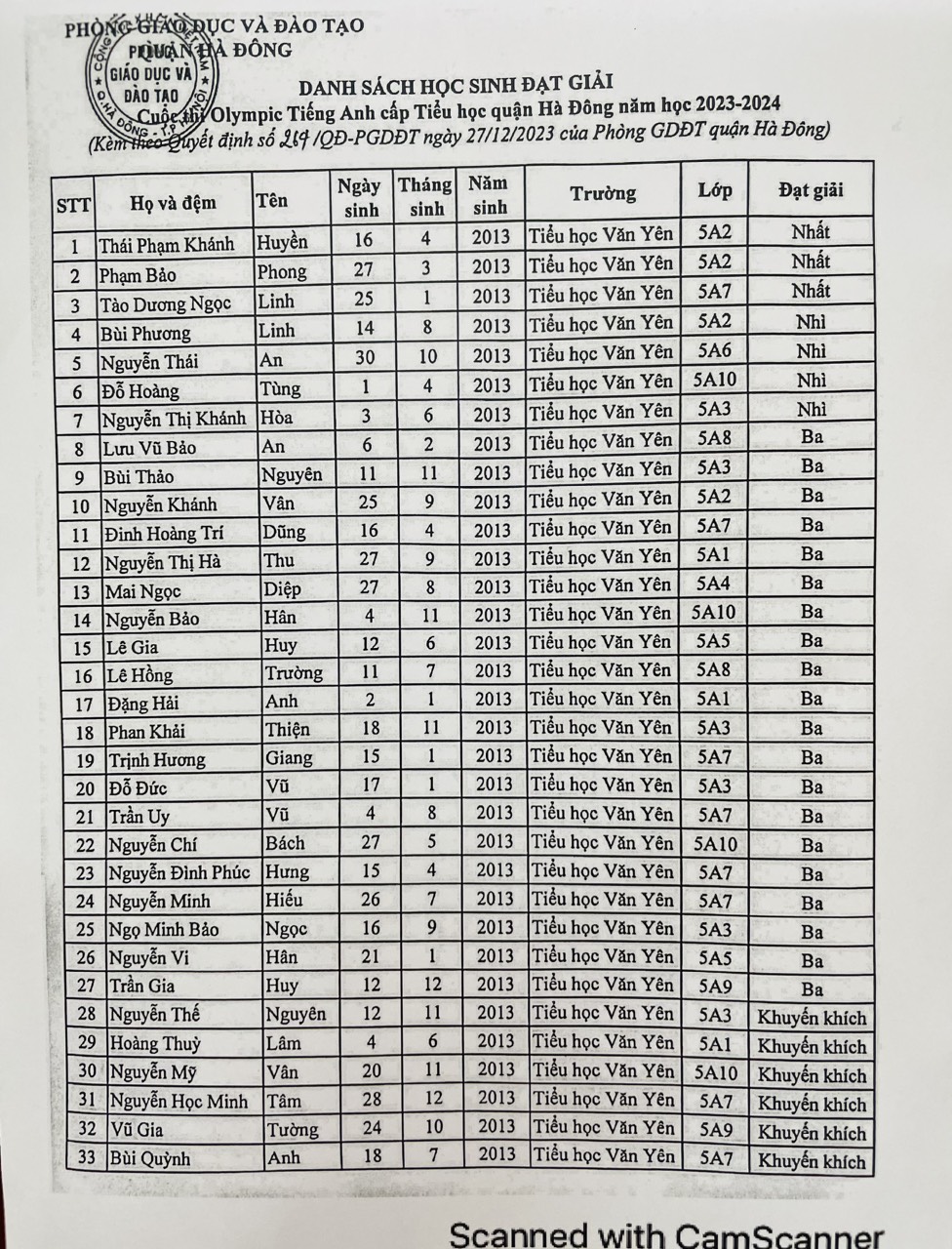 Trải qua nhiều vòng thi được thiết kế theo tiêu chuẩn khảo thí quốc tế kiểm tra toàn diện 4 kỹ năng. 33 học sinh của trường TH Văn Yên tham gia cuộc thi và tất cả 33 học sinh đó đã hoàn thành xuất sắc nhiệm vụ và đạt được các giải thưởng :