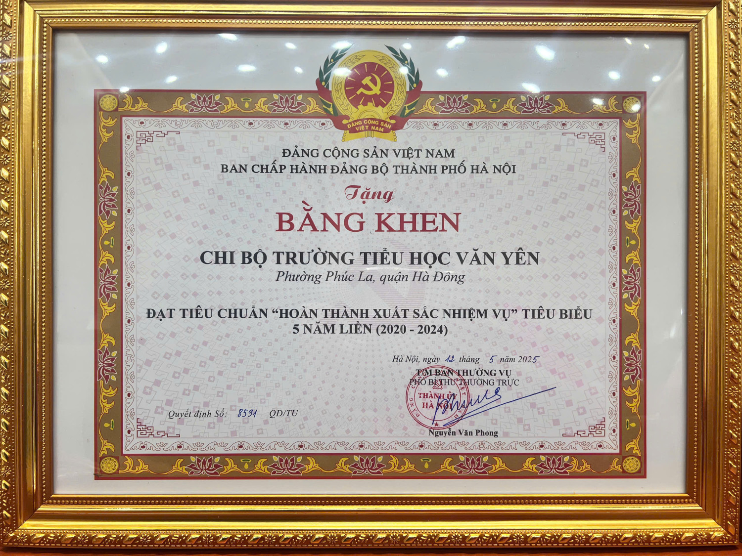 Xin được chúc mừng Chi bộ Trường Tiểu học Văn Yên cùng hai đồng chí đảng viên tiêu biểu đã được vinh danh tại Hội nghị biểu dương, khen thưởng tổ chức Đảng và đảng viên hoàn thành xuất sắc nhiệm vụ 5 năm (2020–2024):