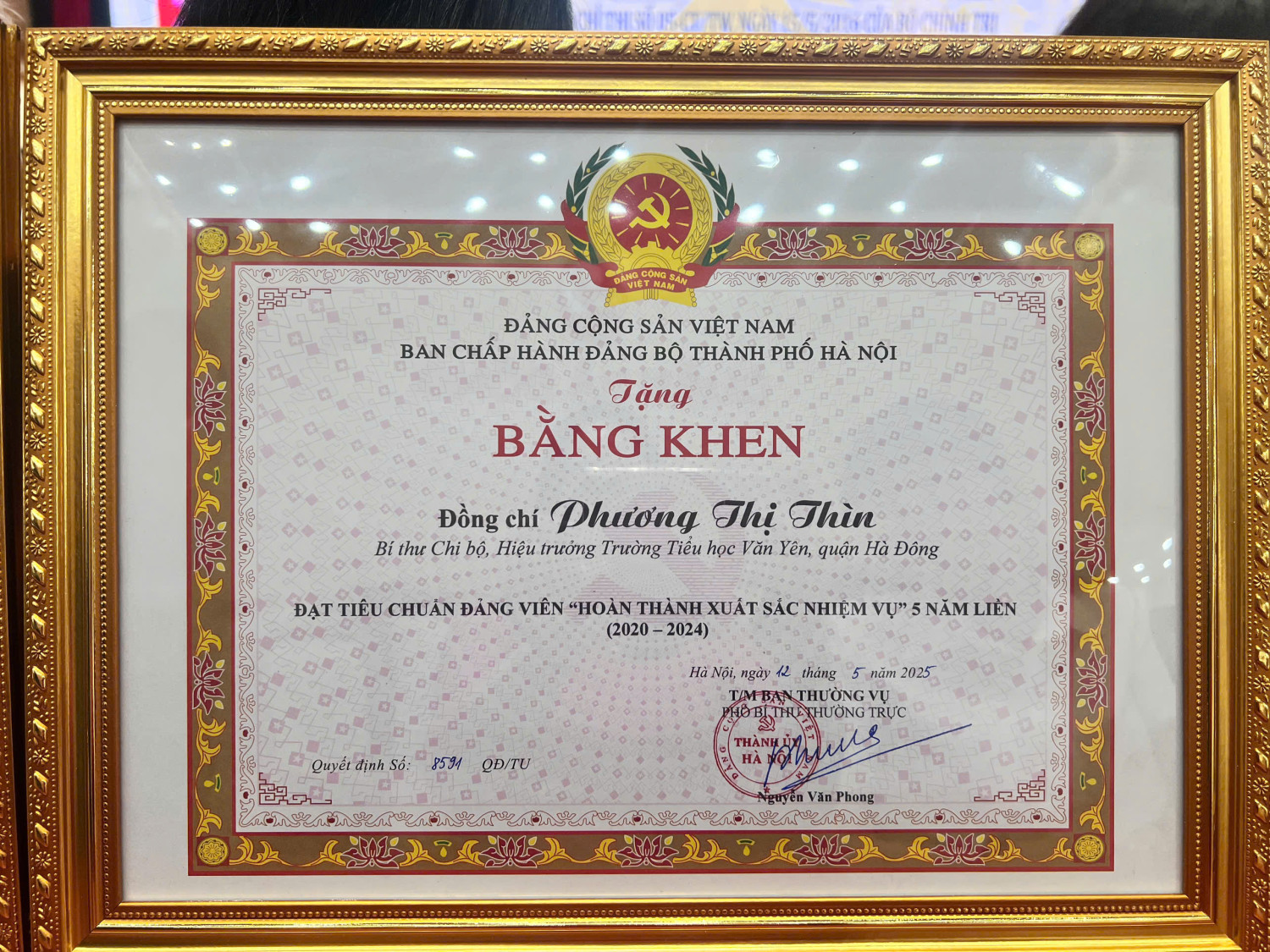 Đồng chí Phương Thị Thìn – Bí thư Chi bộ, Hiệu trưởng nhà trường – đã vinh dự được Ban Thường vụ Thành ủy Thành phố Hà Nội trao tặng Bằng khen vì đã đạt tiêu chuẩn “Hoàn thành xuất sắc nhiệm vụ” tiêu biểu liên tục trong 5 năm liền (2020–2024).
