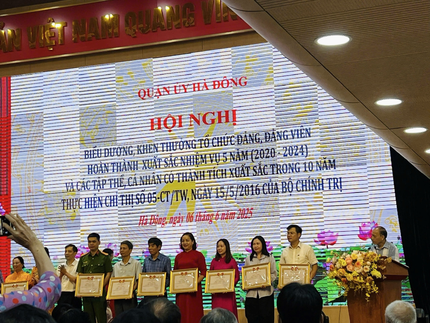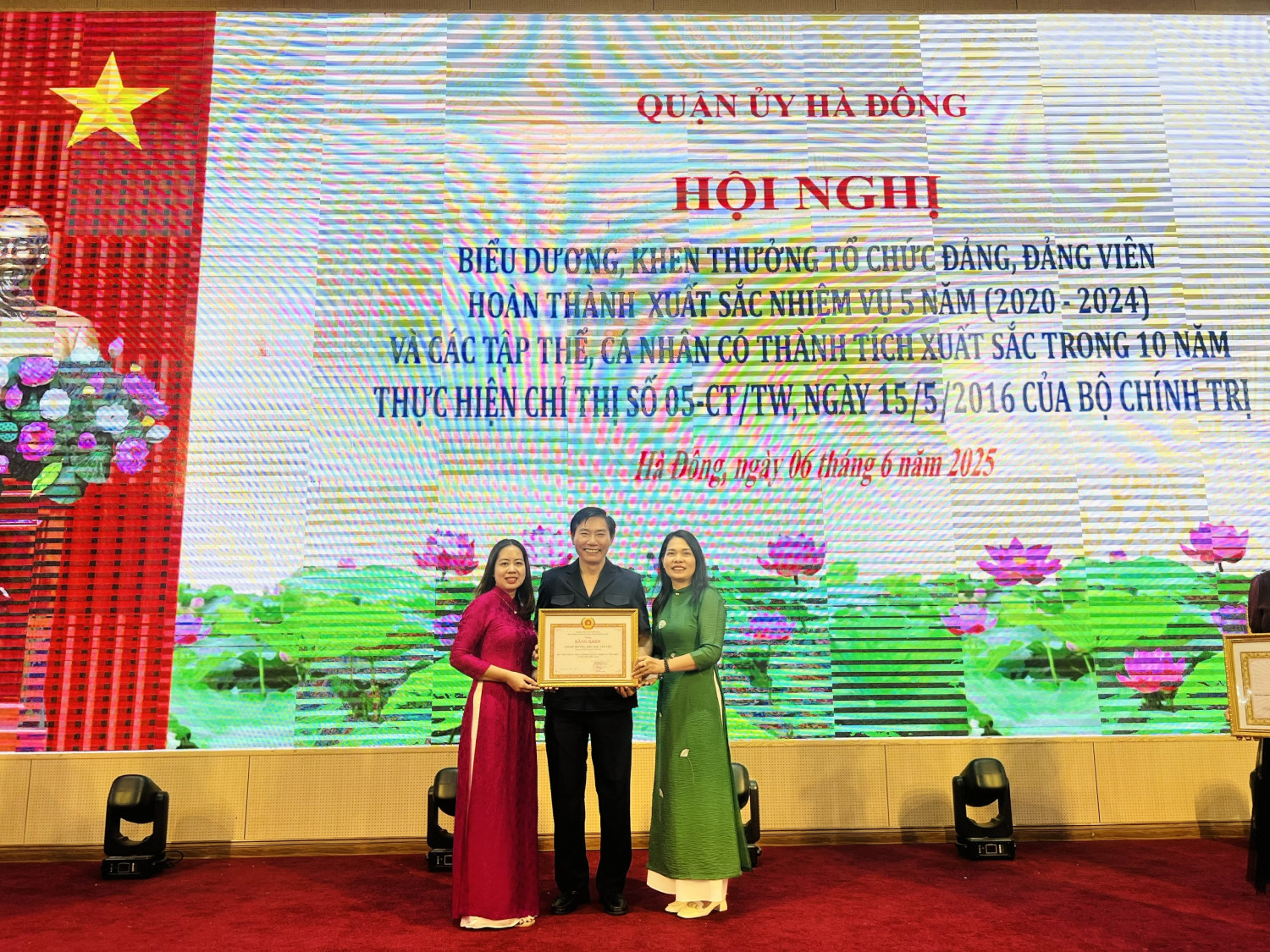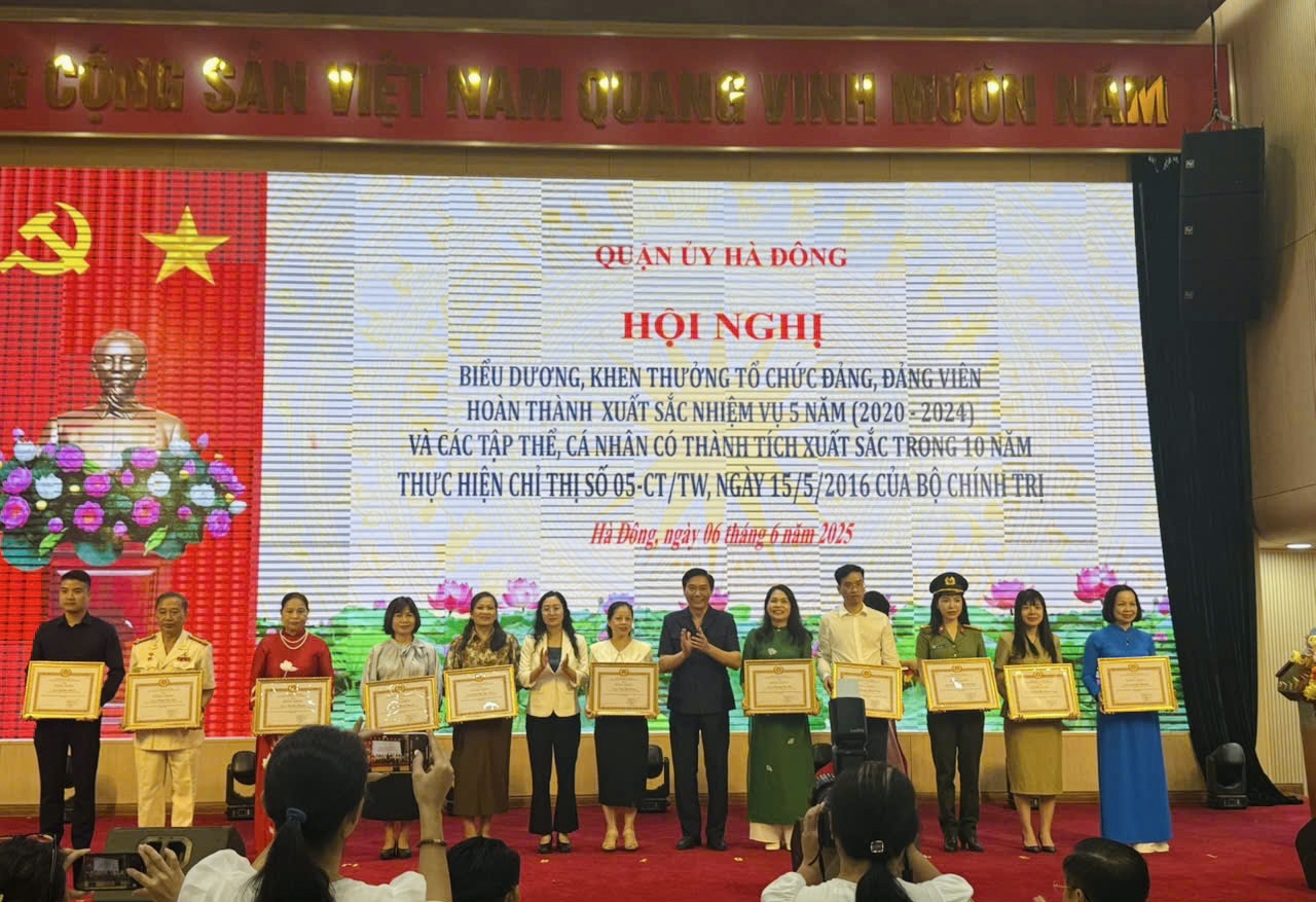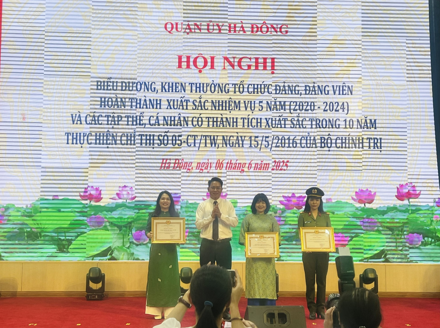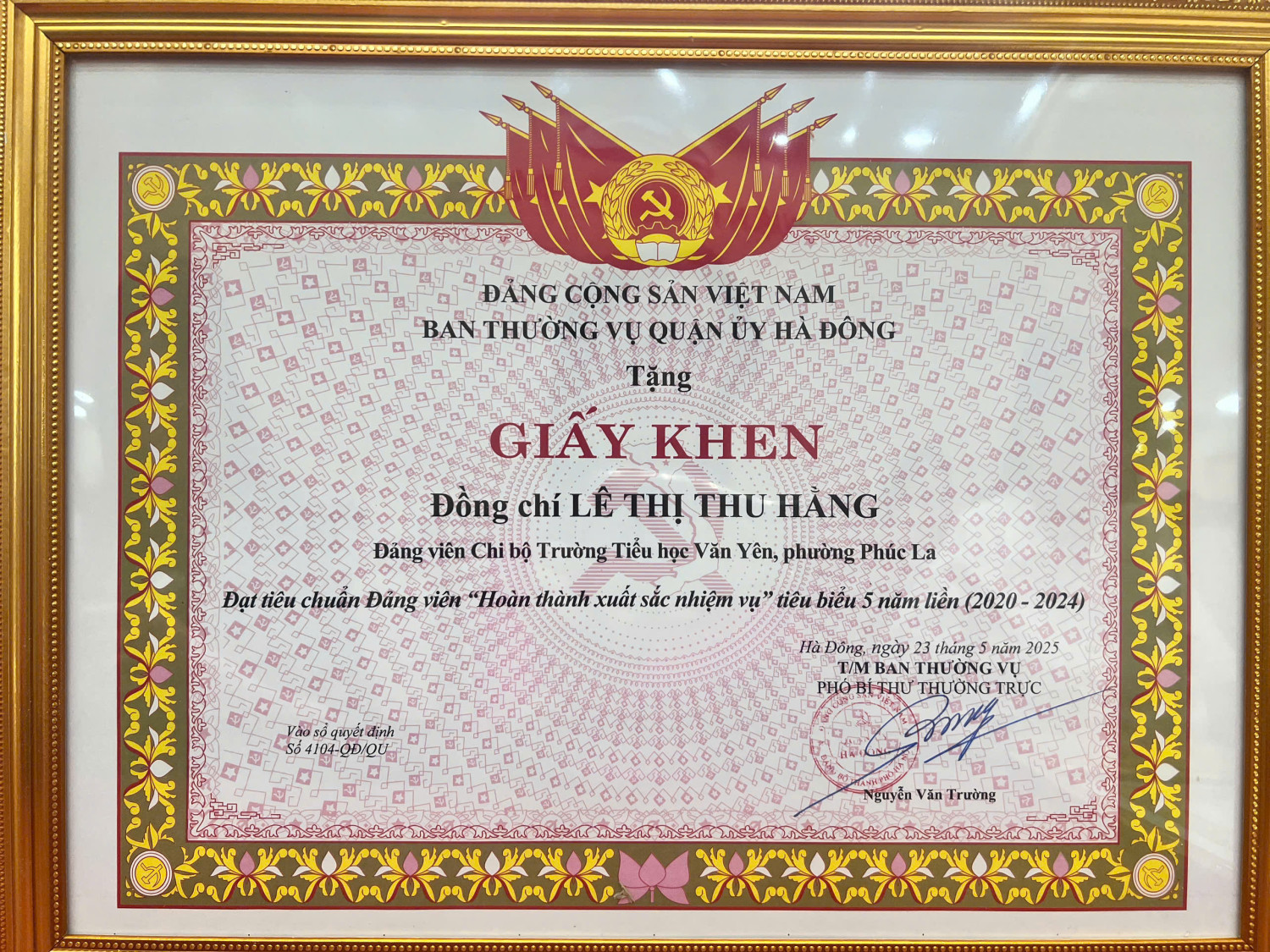 Đồng chí Lê Thị Thu Hằng – Đảng viên, giáo viên khối 5 – đã được Ban Thường vụ Quận ủy quận Hà Đông tặng Giấy khen với thành tích “Hoàn thành xuất sắc nhiệm vụ” tiêu biểu 5 năm liền (2020–2024).
