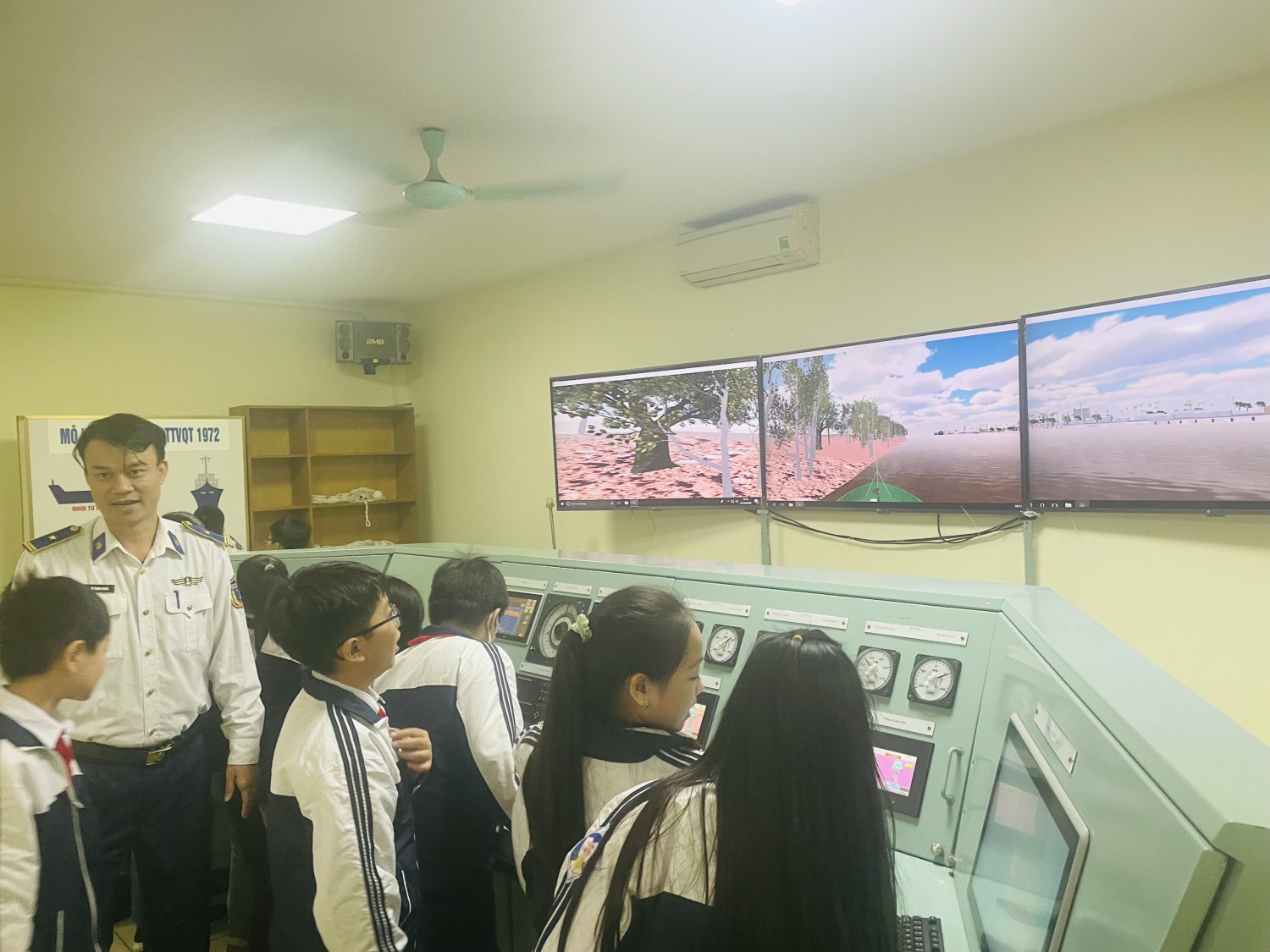 Tại đây các em được nghe các chú chia sẻ về lịch sử Việt Nam đặc biệt là lịch sử địa lý liên quan đến chủ quyền biển đảo, về lịch sử hai quần đảo Hoàng Sa, Trường Sa…, về ý nghĩa thiêng liêng chủ quyền biển đảo và giá trị to lớn chủ quyền mà ông cha ta đã đổ xương máu để xây dựng. Tiếp đó các em được các cô/chú đưa đi Tham quan thư viện, nhà ở của học viên sơ cấp và phòng học mô phỏng.