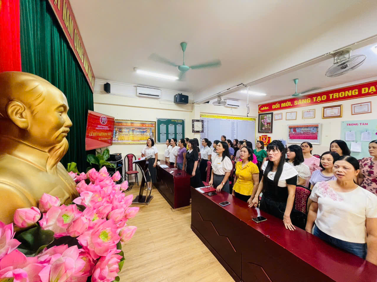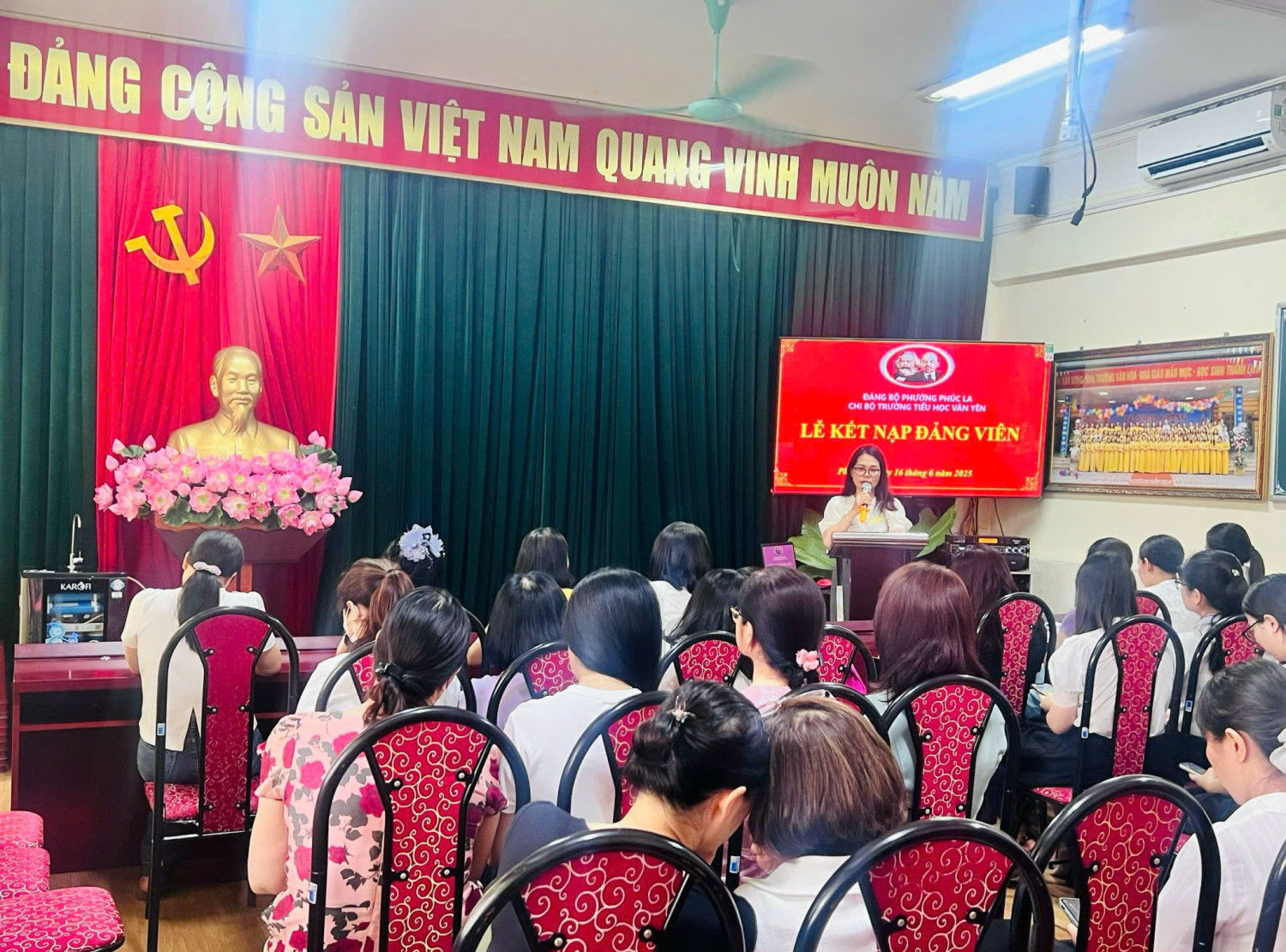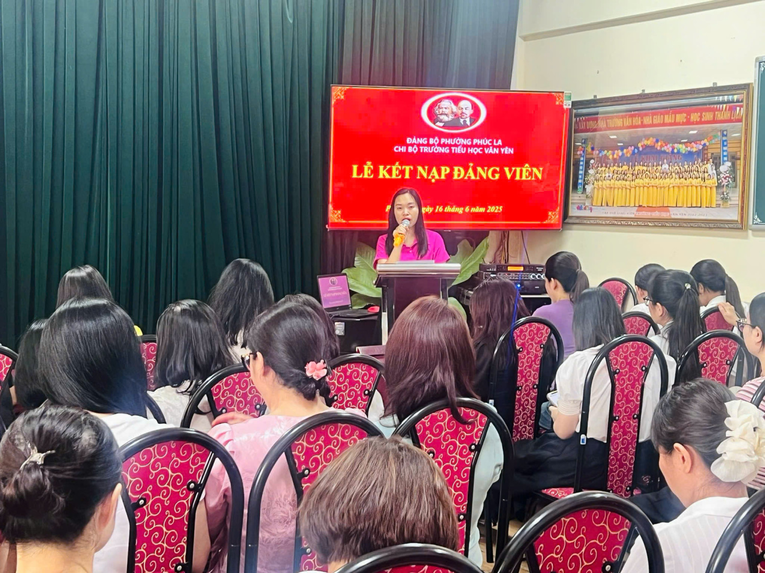 Hôm nay, ngày 16 tháng 6 năm 2025, được sự đồng ý của Đảng ủy phường Phúc La, Chi bộ Trường Tiểu học Văn Yên long trọng tổ chức Lễ kết nạp đảng viên mới cho quần chúng ưu tú Nguyễn Thị Sao Mai – người đã trải qua quá trình rèn luyện, phấn đấu và được chi bộ cùng các tổ chức đoàn thể tín nhiệm giới thiệu đứng vào hàng ngũ của Đảng Cộng sản Việt Nam.