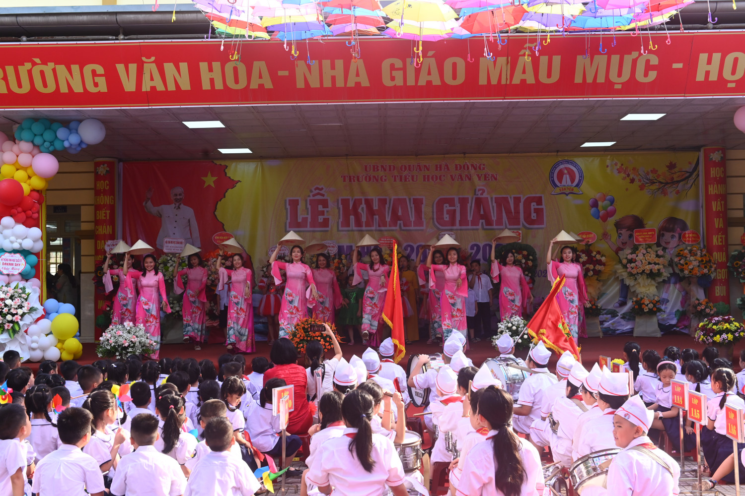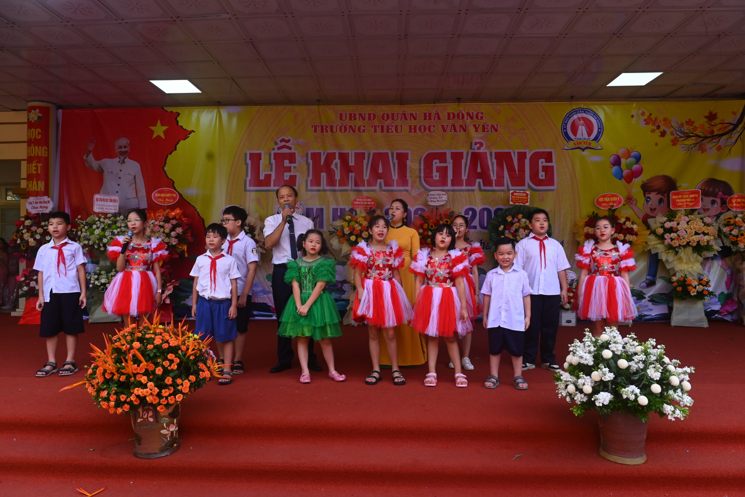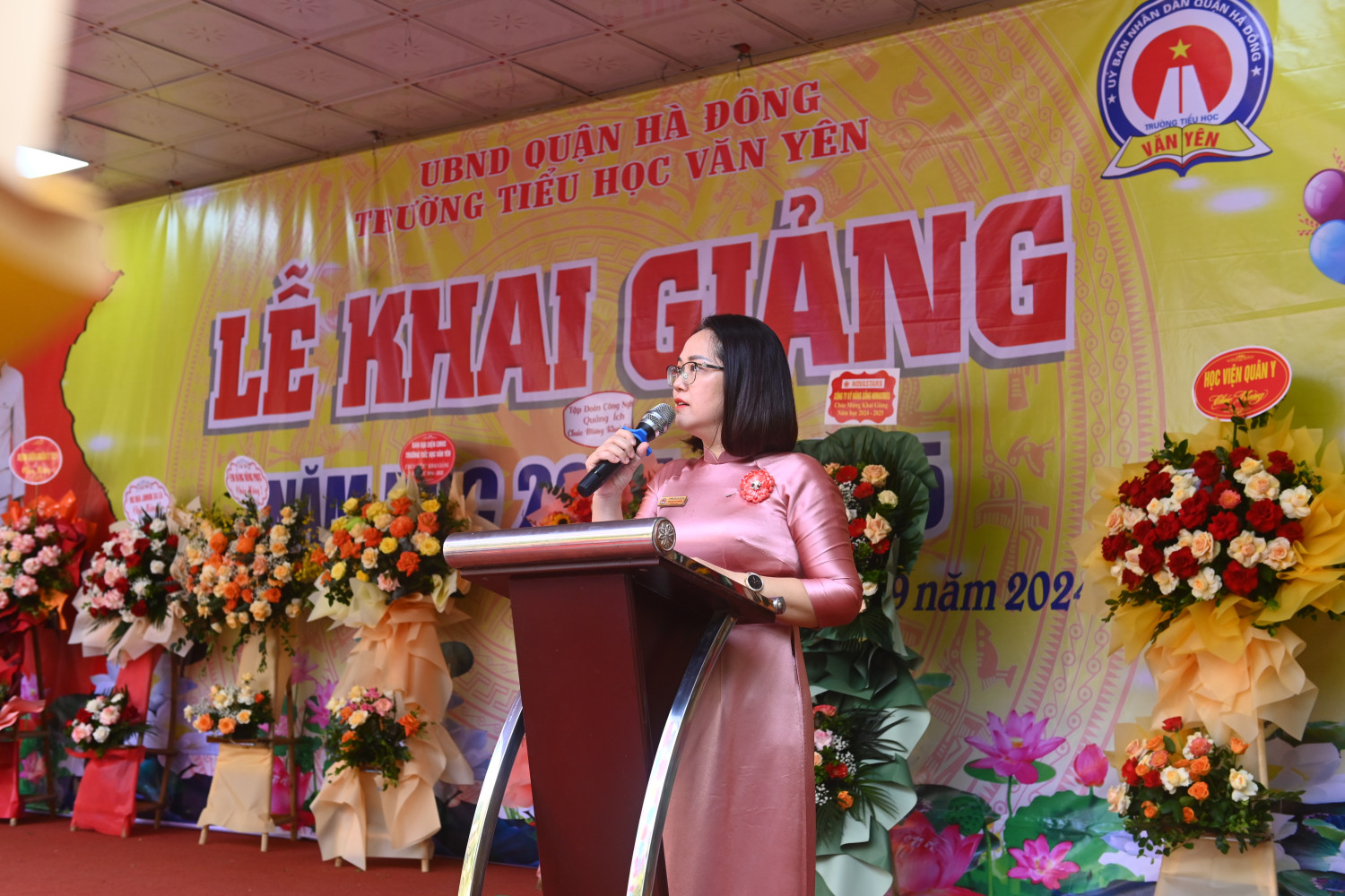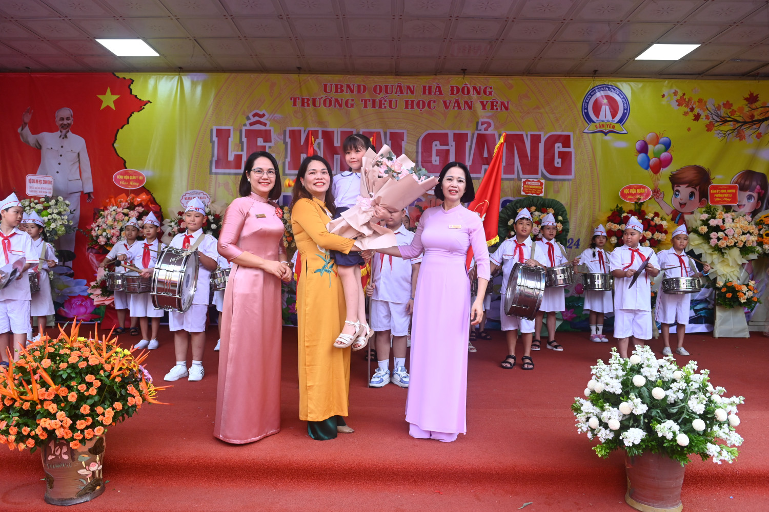 Lễ khai giảng năm học 2024-2025 tại trường Tiểu học Văn Yên, quận Hà Đông, đã diễn ra trong không khí hân hoan và trang trọng. Sáng sớm ngày 5 tháng 9, các thầy cô giáo, phụ huynh và học sinh đã có mặt đông đủ tại sân trường, nơi được trang trí lộng lẫy với cờ hoa và băng rôn chúc mừng năm học mới. Trong ánh nắng vàng rực rỡ, các em học sinh, đặc biệt là các bạn lớp 1, bước vào sân trường với nụ cười rạng rỡ và những bộ đồng phục mới tinh.