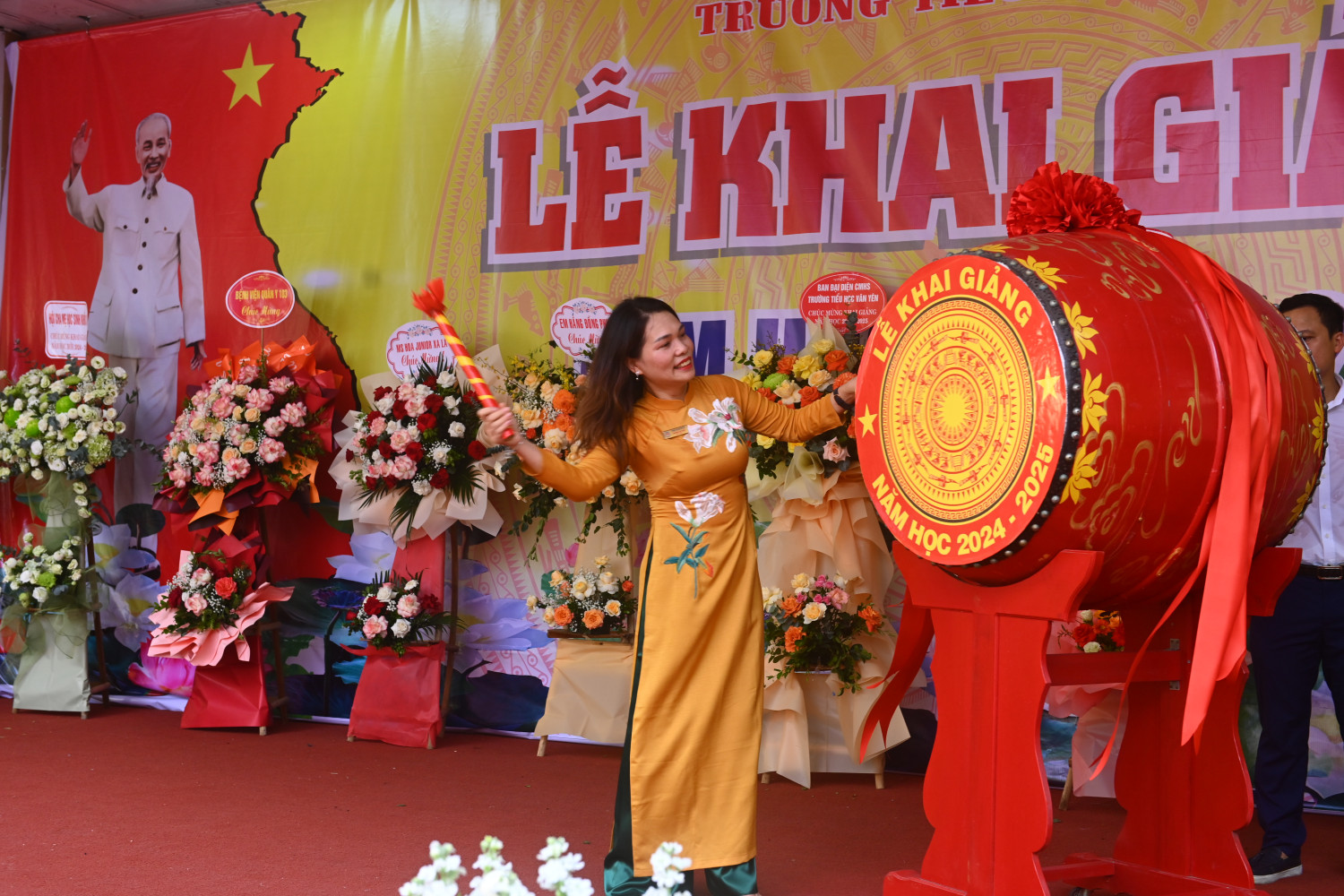Tiếp đến cô Phương Thị Thìn – Đảng ủy viên, Bí thư chi bộ - Hiệu trưởng nhà trường lên phát biểu tuyên bố lễ khai giảng năm học mới và đánh trống chính thức khai giảng năm học 2024-2025. Cô bày tỏ sự vui mừng khi thấy sự hiện diện đông đủ của các em học sinh, phụ huynh và đội ngũ giáo viên. Với những lời chúc mừng, cô khuyến khích các em học sinh nỗ lực học tập, rèn luyện để đạt được những thành tích xuất sắc trong năm học mới. Tiếng trống tuyên bố khai giảng kết thúc buổi lễ trong niềm vui và sự háo hức, mở ra một năm học mới đầy triển vọng và hứng khởi.