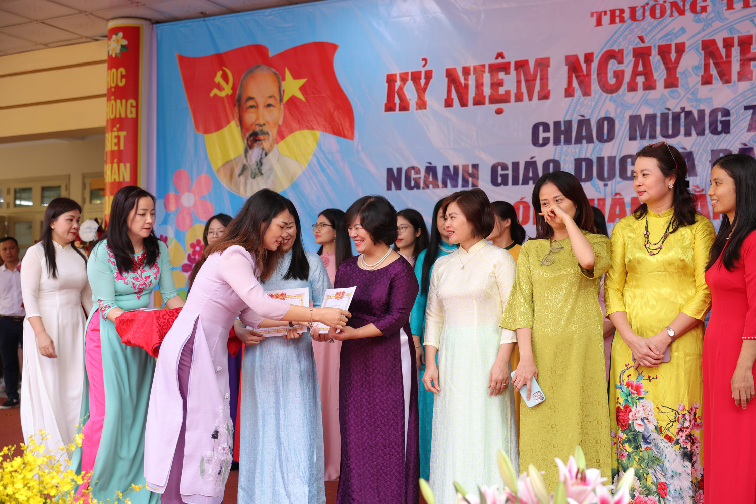 Tiếp đến là phần tổng kết và trao phần thưởng cho các cá nhân, tập thể có thành tích xuất sắc trong đợt thi đua chào mừng ngày Nhà giáo Việt Nam 20/11. Các giáo viên có thành tích xuất sắc trong giảng dạy được trao thưởng và tuyên dương, góp phần khích lệ tinh thần học tập, sáng tạo của đội ngũ giáo viên. Các học sinh và tập thể lớp có kết quả tốt trong các cuộc thi như viết chữ đẹp, làm báo tường, trang trí lớp học, cờ vua, nhảy bao bố, kéo co cũng được vinh danh. Những phần thưởng này không chỉ là sự ghi nhận thành tích mà còn là động lực để các em học sinh và thầy cô tiếp tục cố gắng, phát huy hơn nữa trong những năm học tới.