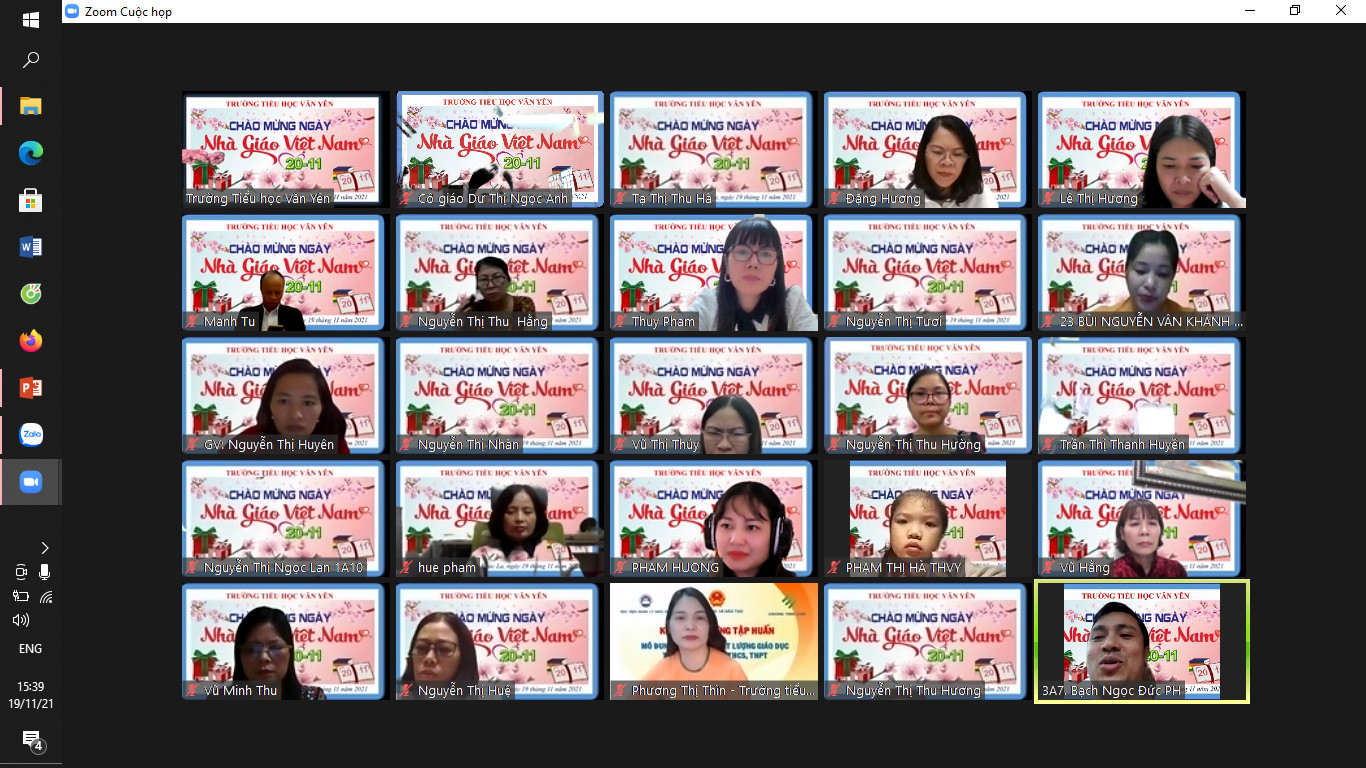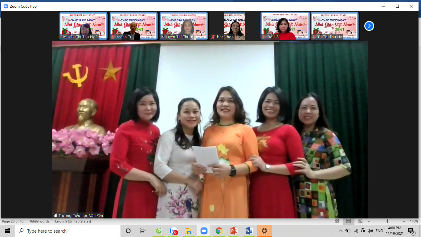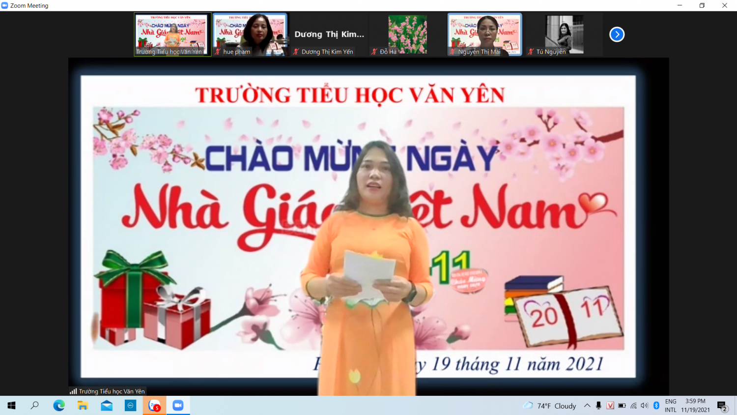 Trong ký ức của mỗi người Việt Nam, khi tháng 11 về, ai cũng háo hức đón chào một ngày đặc biệt, đó là ngày Nhà giáo Việt Nam. Hôm nay, trong điều kiện đại dịch Covid-19 diễn biến phức tạp, chúng ta không thể trực tiếp gặp nhau được. Hòa chung không khí tưng bừng trên mọi miền Tổ quốc chào mừng ngày Nhà giáo Việt Nam. Trường Tiểu học Văn Yên tổ chức buổi mít tinh bằng hình thức trực tuyến vào 15 giờ ngày thứ sáu 19/11/2021. Phát biểu trong buổi lễ, cô giáo Phương Thị Thìn - Hiệu trưởng nhà trường mong rằng, tất cả thành viên nhà trường hãy nỗ lực vượt khó, phát huy tinh thần yêu nghề, hoàn thành kế hoạch năm học đã đề ra. Dưới đây là một số hình ảnh tại buổi lễ mít tinh: