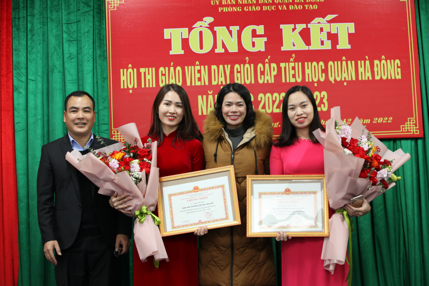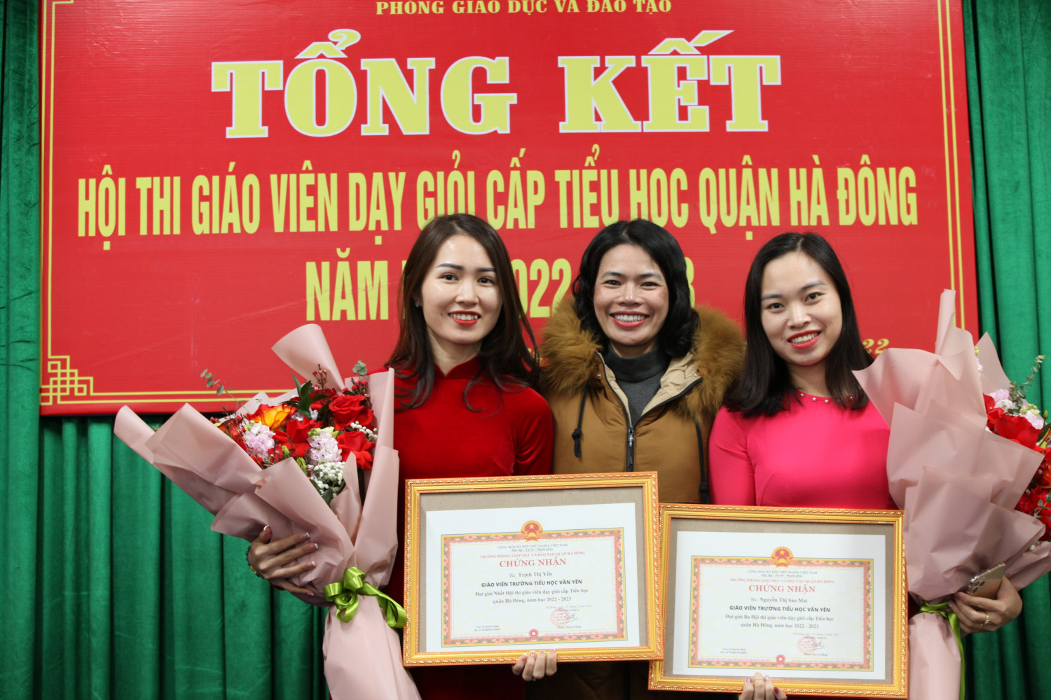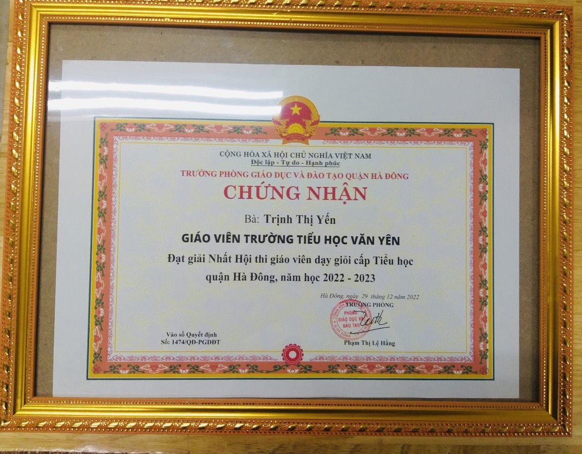 Chiều ngày 30/12/2022, Phòng Giáo dục Quận Hà Đông tổ chức Tổng kết Hội thi "Giáo viên dạy giỏi cấp tiểu học quận Hà Đông năm học 2022-2023”. Giáo viên trường Tiểu học Văn Yên vinh dự đạt được 02 giải tại hội thi: 01 giải nhất môn Tiếng Việt và 01 giải ba môn Mĩ thuật.Xin chúc mừng 2 cô giáo Trịnh Thị Yến và cô giáo Nguyễn Thị Sao Mai. Chúc các cô sẽ tiếp tục gặt hái nhiều thành tích hơn nữa bằng tài năng và tâm huyết của mình trong công tác giảng dạy.