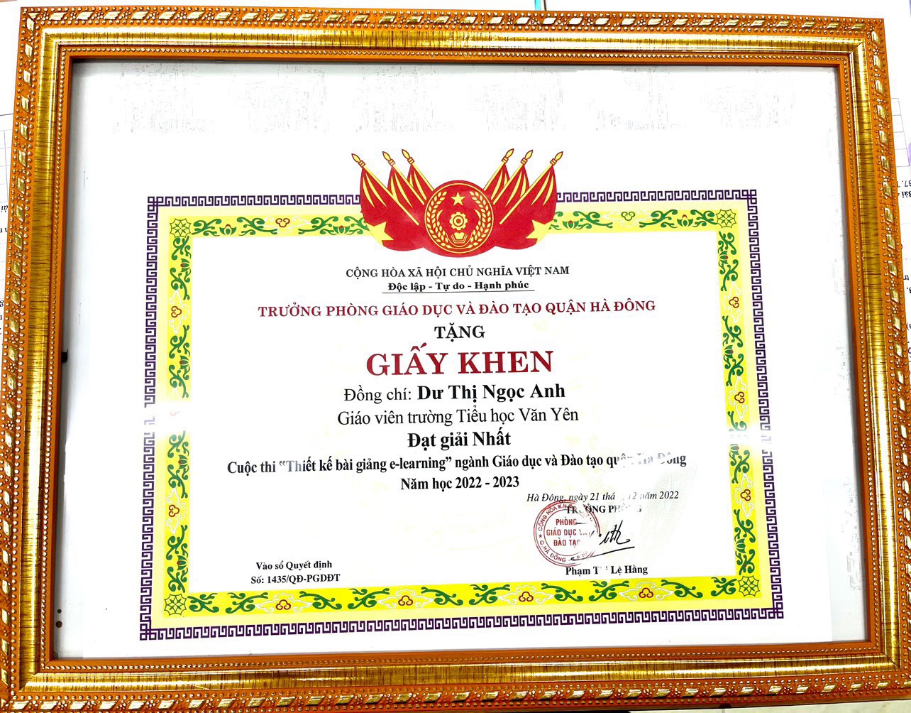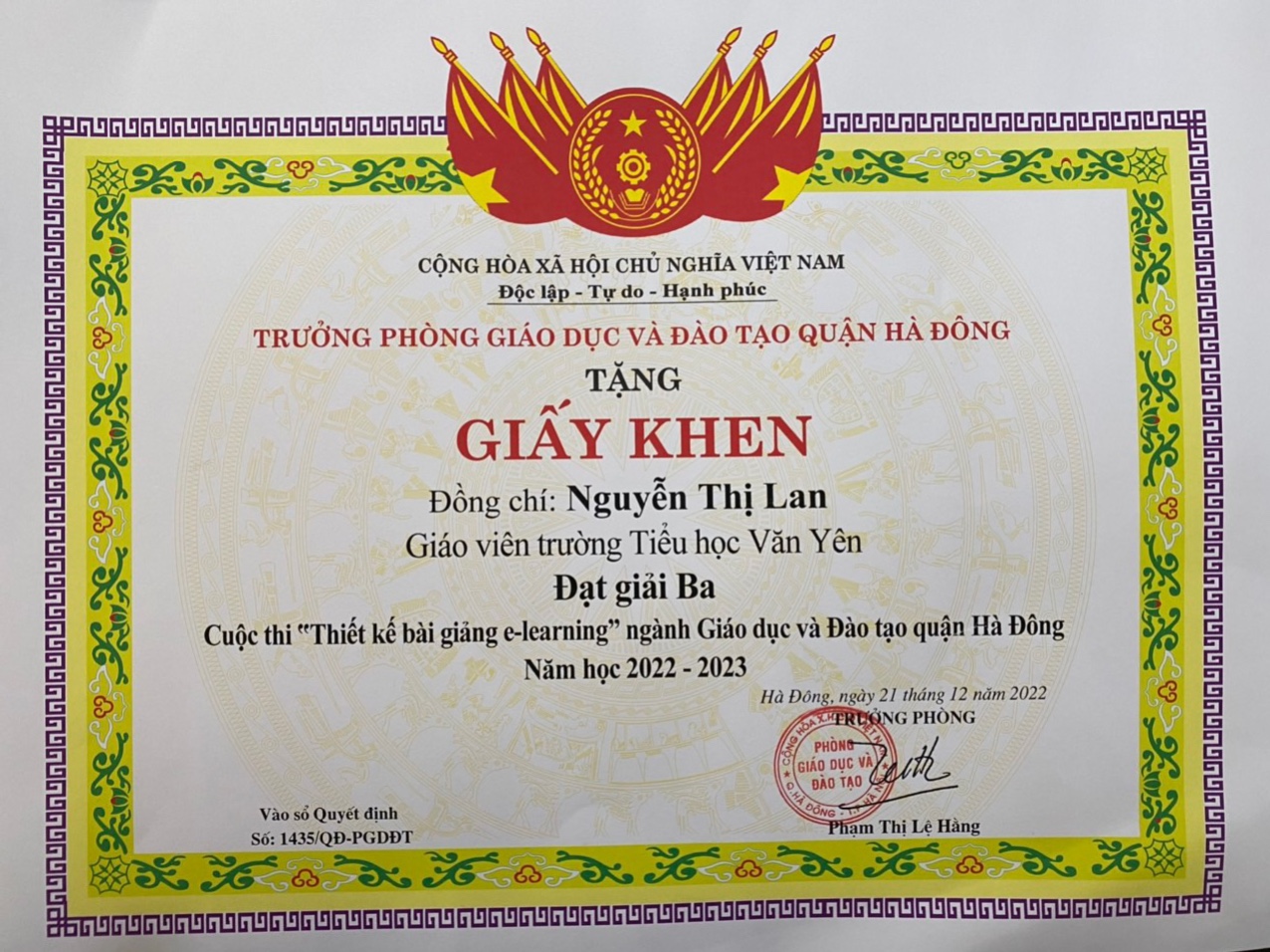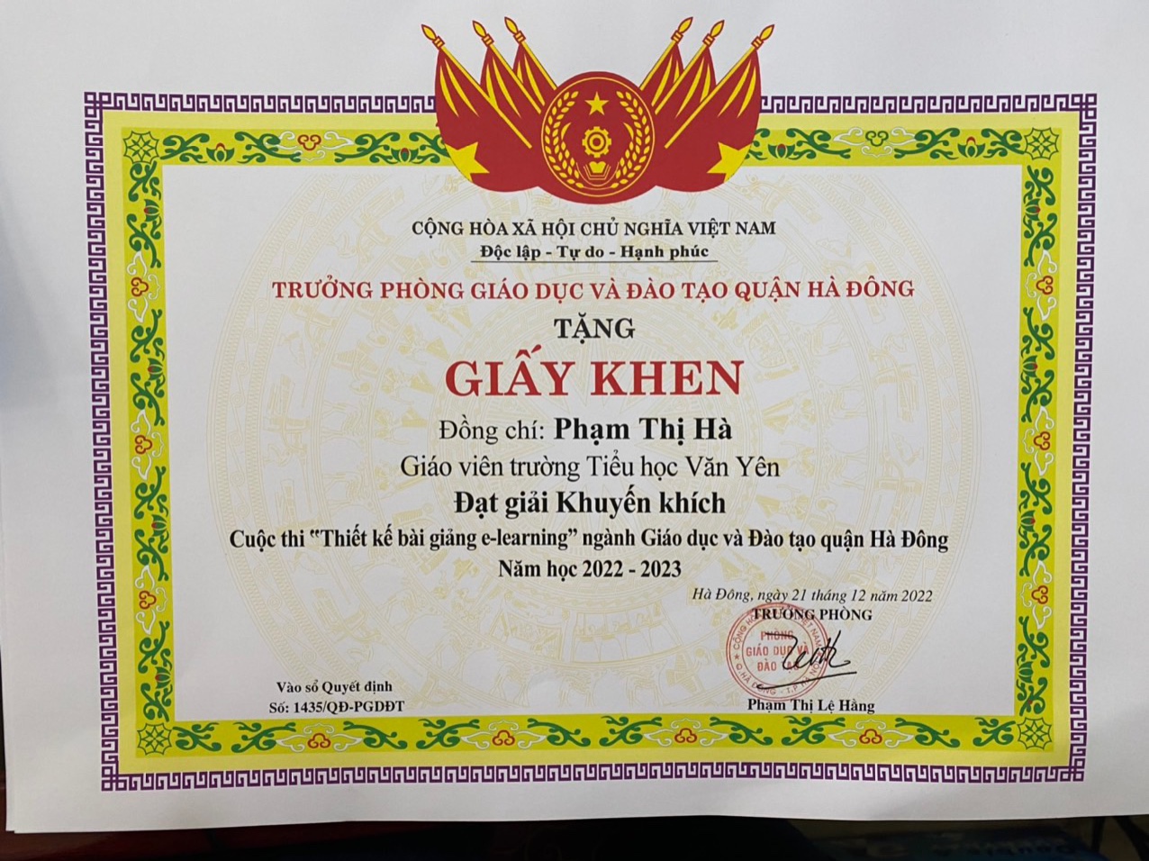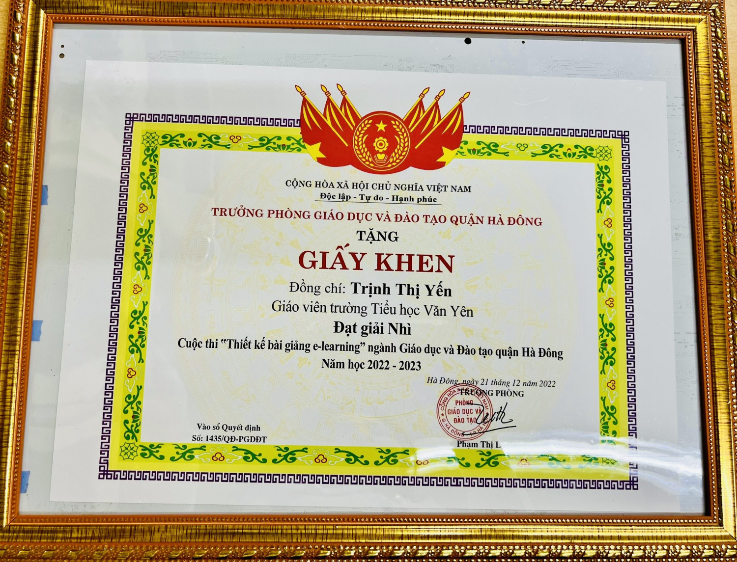 Ngày 22/12/2022, phòng giáo dục và đào tạo quận Hà Đông tổ chức hội nghị tổng kết và trao giải cuộc thi “Thiết kế bài giảng elearning” năm học 2022 - 2023 Trường tiểu học Văn Yên đã xuất sắc dành 01 giải nhất và 01 giải nhì. Giải thưởng không chỉ là sự ghi nhận những cố gắng không ngừng của các cô mà còn là sự khẳng định giáo viên tronh Nhà trường đã và đang làm chủ công nghệ, làm chủ tri thức.