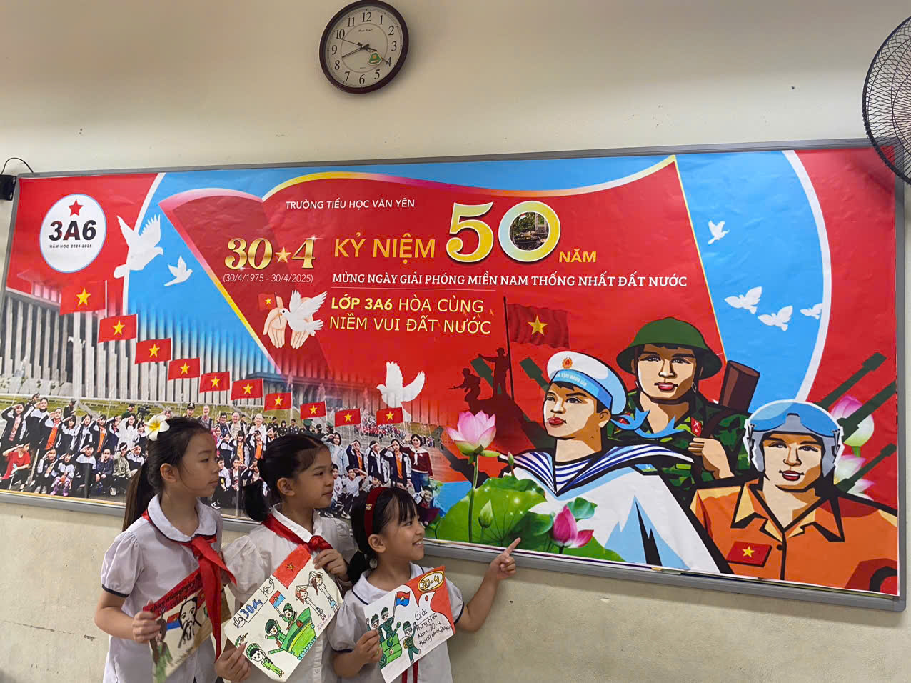 Từ cổng trường, sân trường, hành lang và trong các lớp học của trường Tiểu học Văn Yên những ngày này như khoác lên mình chiếc áo mới rực rỡ. Cờ đỏ sao vàng tung bay phấp phới trong nắng sớm, tạo nên không khí tưng bừng, náo nức chào mừng 50 năm ngày thống nhất Đất Nước (30/4/1975 - 30/4/2025). Thầy cô và học trò cùng nhau ôn lại trang sử hào hùng của dân tộc.