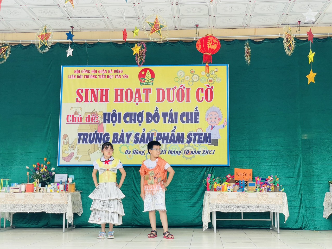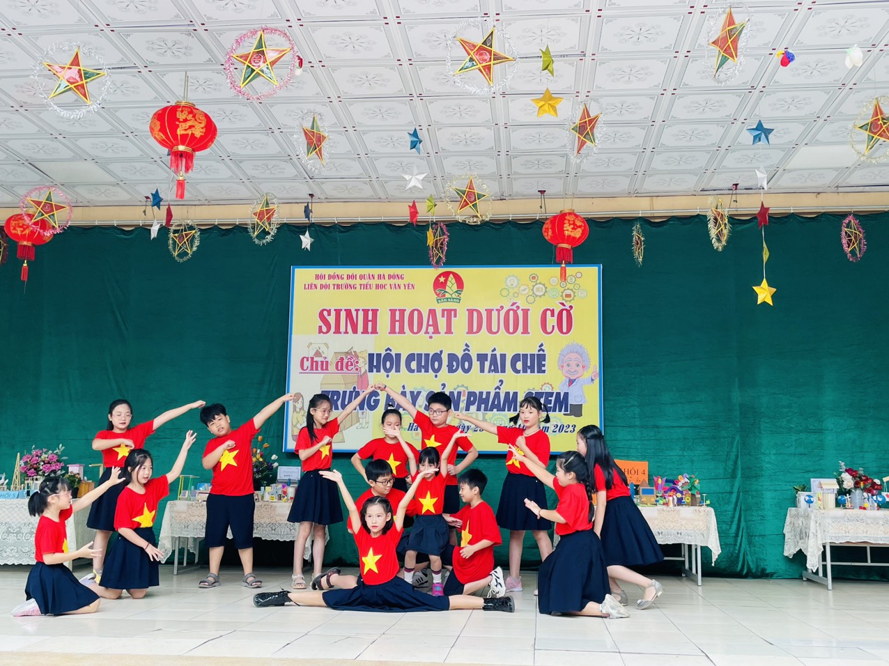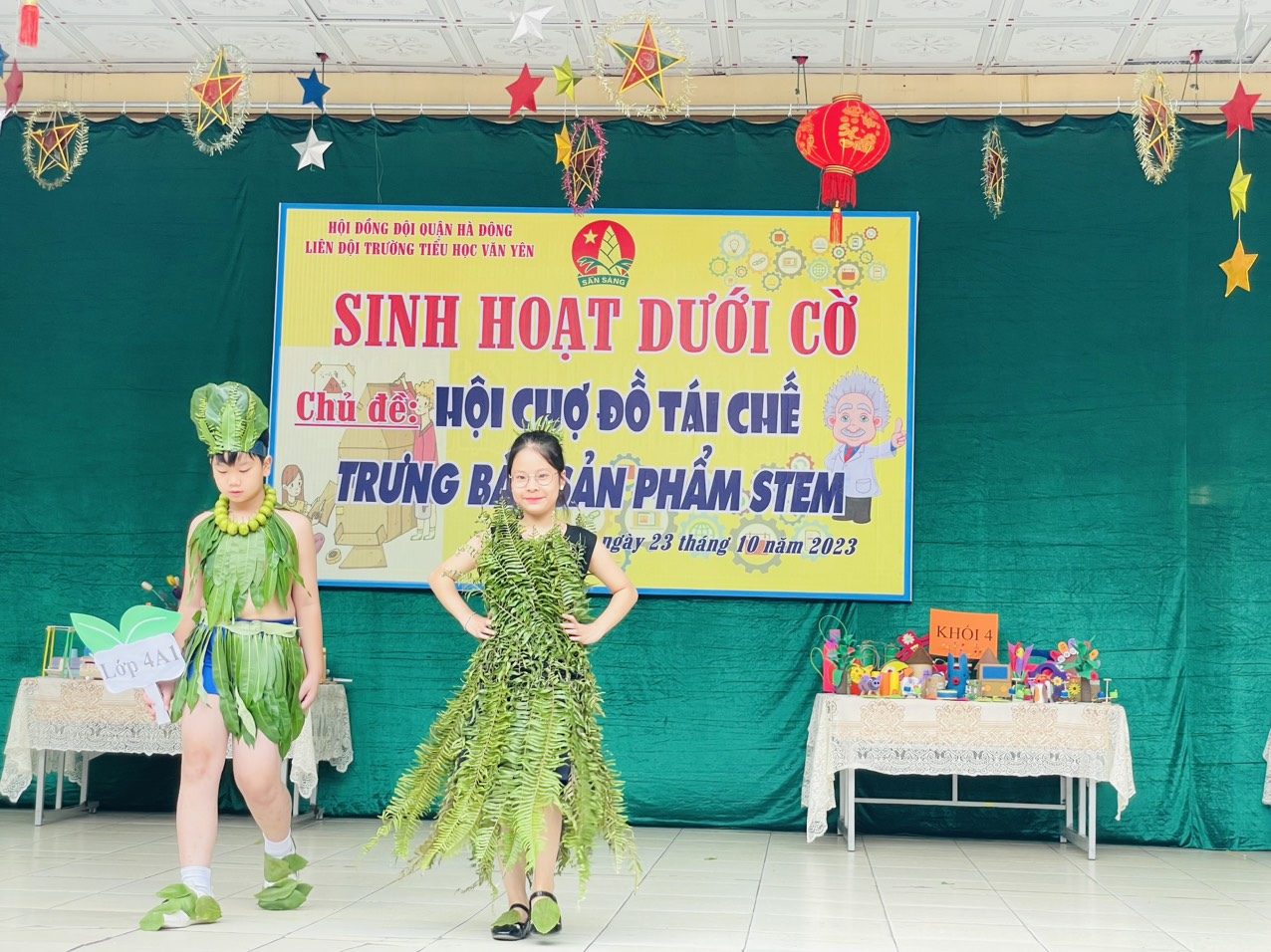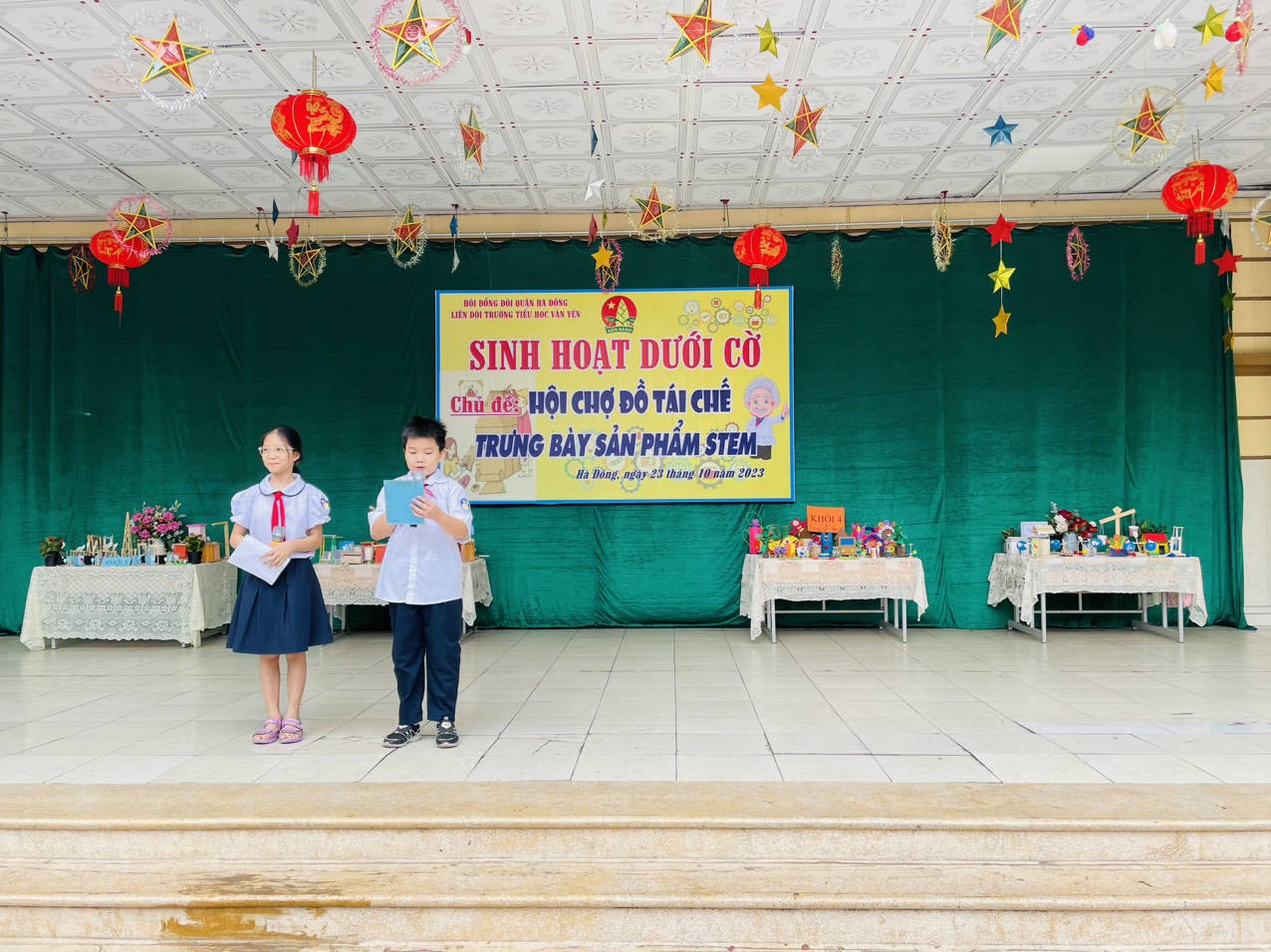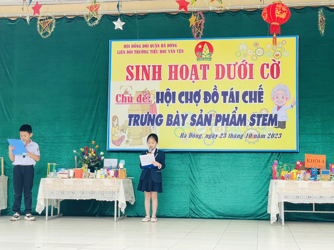 Tiết sinh hoạt dưới cờ với chủ đề: Hội chợ đồ tái chế và trưng bày sản phẩm Stem, hoạt động giúp các em được bộc lộ nhiều năng khiếu tiềm ẩn, rèn luyện nhiều kỹ năng mềm thiết yếu như: tổ chức hoạt động, làm việc nhóm,..., tiết sinh hoạt dưới cờ tổ chức ngoài không gian lớp học mang đến không khí thoải mái, sôi nổi mở đầu tuần học mới.