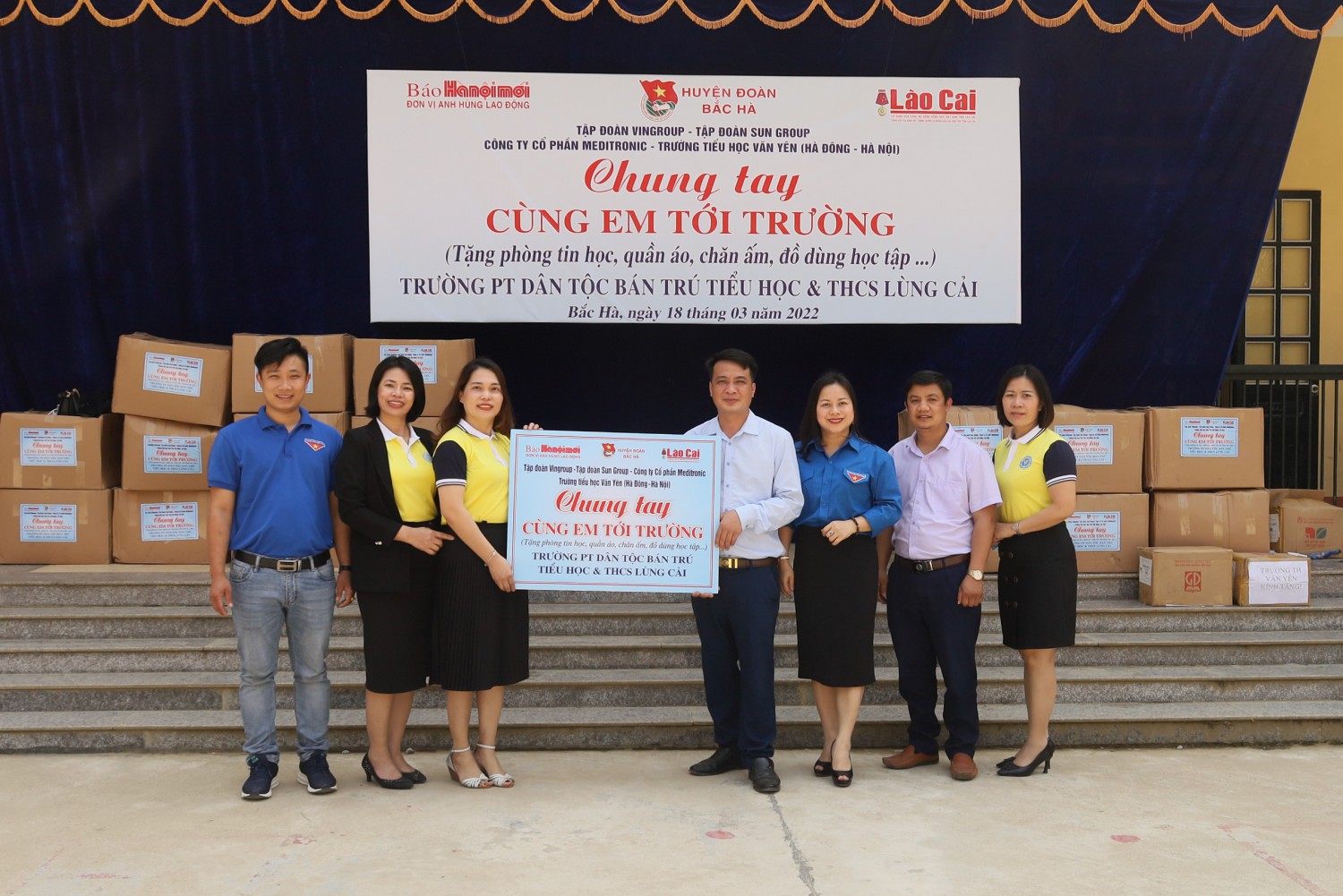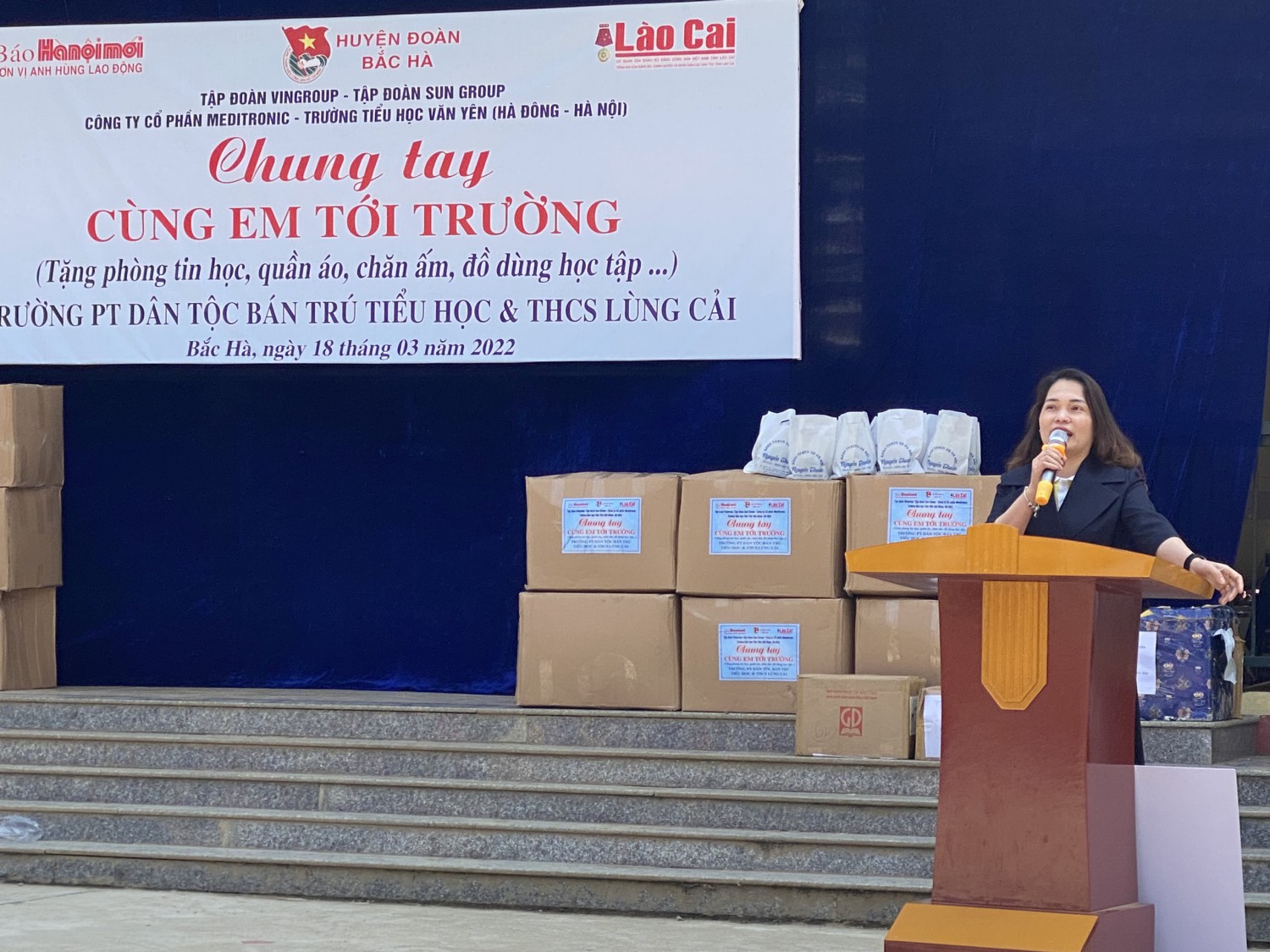 Ngày 18-3-2022 Bà Phương Thị Thìn - Bí thư Chi bộ - Hiệu Trưởng Trường Tiểu học Văn Yên cùng đoàn Thanh niên nhà trường đã tổ chức chương trình từ thiện, phát huy tinh thần “tương thân, tương ái”, “lá lành đùm lá rách” tại trường Phổ thông dân tộc bán trú Tiểu học và Trung học cơ sở Lùng Cải huyện Si Ma Cai, tỉnh Lào Cai. Nhà trường đã trao tặng 1.311 vở viết, 430 áo đồng phục, 3 thùng truyện, chăn ấm và nhiều phần quà....vv. Trong bối cảnh dịch Covid-19 vẫn còn diễn biến phức tạp, những phần quà tuy nhỏ nhưng ý nghĩa đã tiếp thêm sức mạnh để thầy và trò Trường Phổ thông dân tộc bán trú Tiểu học và Trung học cơ sở Lùng Cải tiếp tục vượt qua khó khăn, kiên trì với sự nghiệp “trồng người”.
