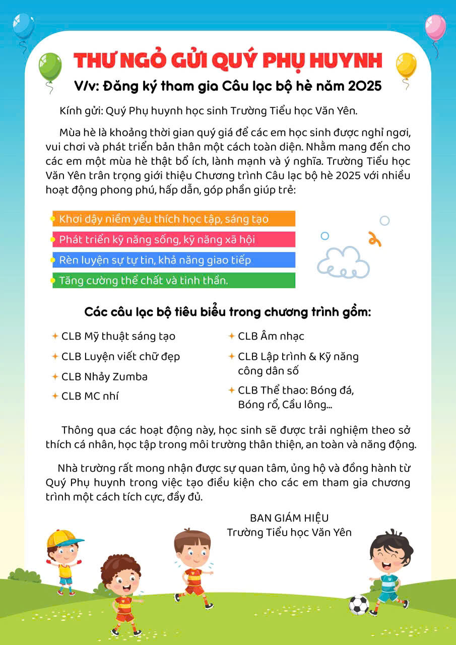 Với mong muốn mang đến cho học sinh một mùa hè bổ ích – năng động – an toàn. Trường Tiểu học Văn Yên chính thức khởi động chương trình Câu lạc bộ hè với thông điệp: Nói không với ti vi, điện thoại – nói “có” với vận động, sáng tạo và trải nghiệm thực tế.
