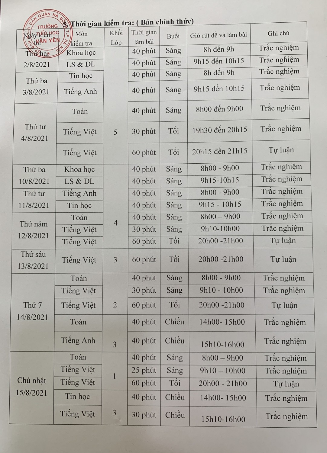 Lịch kiểm tra của học sinh trường Tiểu học Văn Yên từ ngày 2/8 đến 15/8. Trong đó, đề kiểm tra môn Toán, Tiếng Anh, Tin học, Khoa học, Lịch sử và Địa lý có cấu trúc trắc nghiệm, đề môn Tiếng Việt kết hợp cả trắc nghiệm và tự luận. Để học sinh làm quen với phương thức kiểm tra trực tuyến, hơn 1 tuần qua, giáo viên chủ nhiệm các lớp đã cho học sinh ôn tập và kiểm tra thử online.