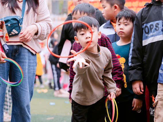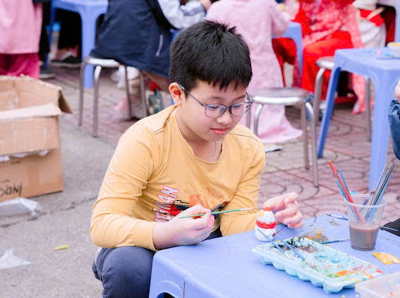 Không chỉ có các gian hàng, hội chợ còn tổ chức khu vực trò chơi dân gian thú vị, giúp các em học sinh được tham gia, thư giãn và trải nghiệm các hoạt động truyền thống. Các trò chơi như bịt mắt bắt vịt, ném vòng cổ chai, tô tượng, tò he, ông đồ viết thư pháp, nhà hơi, phi tiêu, đập niêu... đã thu hút sự tham gia đông đảo của các em. Những trò chơi này không chỉ vui nhộn mà còn giúp học sinh hiểu sâu sắc hơn về các hoạt động giải trí đặc trưng trong dịp Tết cổ truyền.